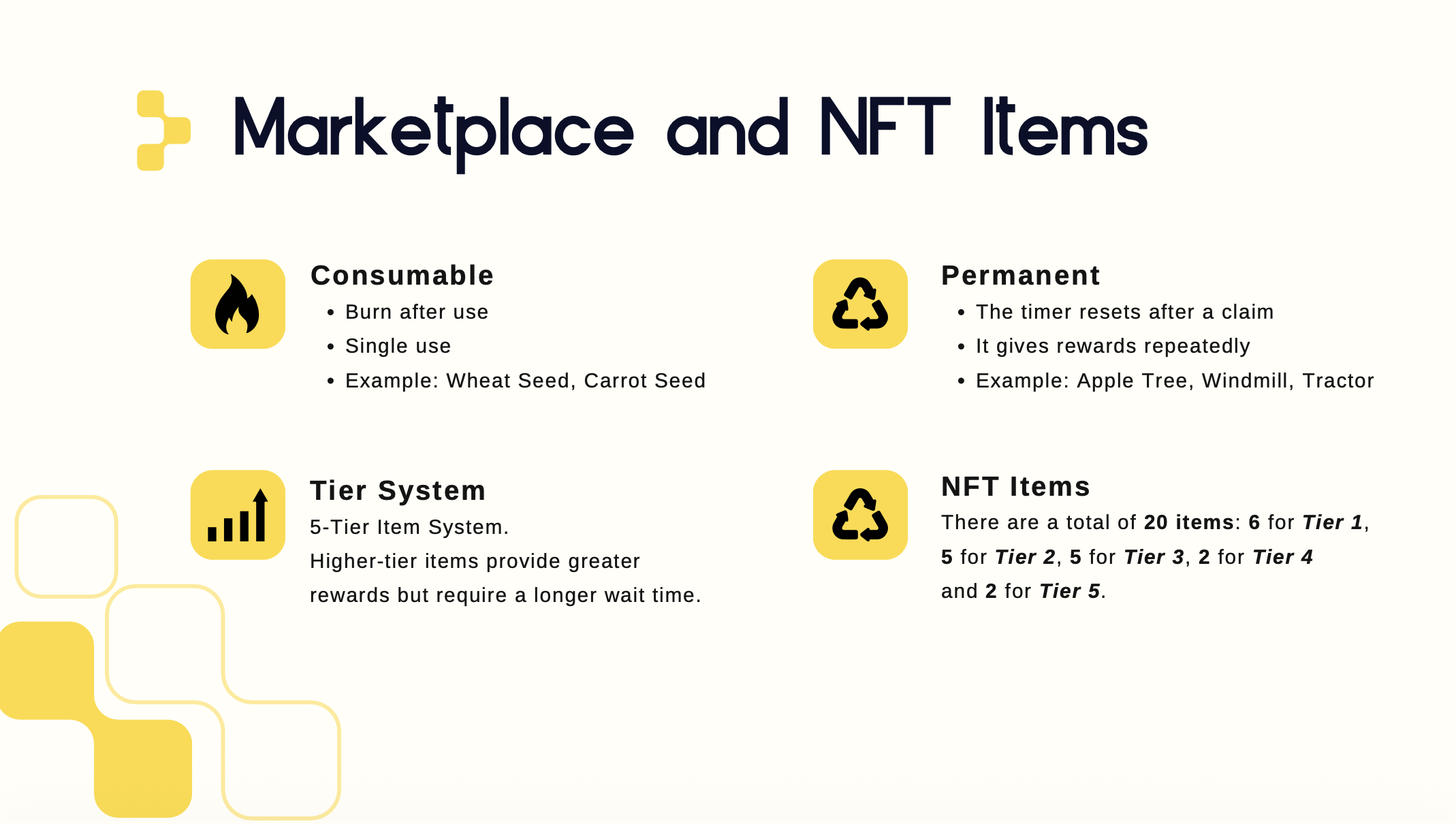 Consumable NFTs disappear after harvest, while permanent NFTs continue production.